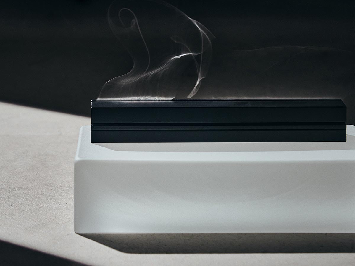 線香タイプのお香を横倒しに置いて焚く香炉。直線的なスリットから少しずつ立ち昇る香煙で香りがやさしく広がります。香煙は揺らいだり、その場にとどまったりと、視覚的にもお楽しみいただけます。重厚感のあるマットな質感の香炉と、有機的で偶発的な表情を見せる香煙とのコントラストが印象的です。
