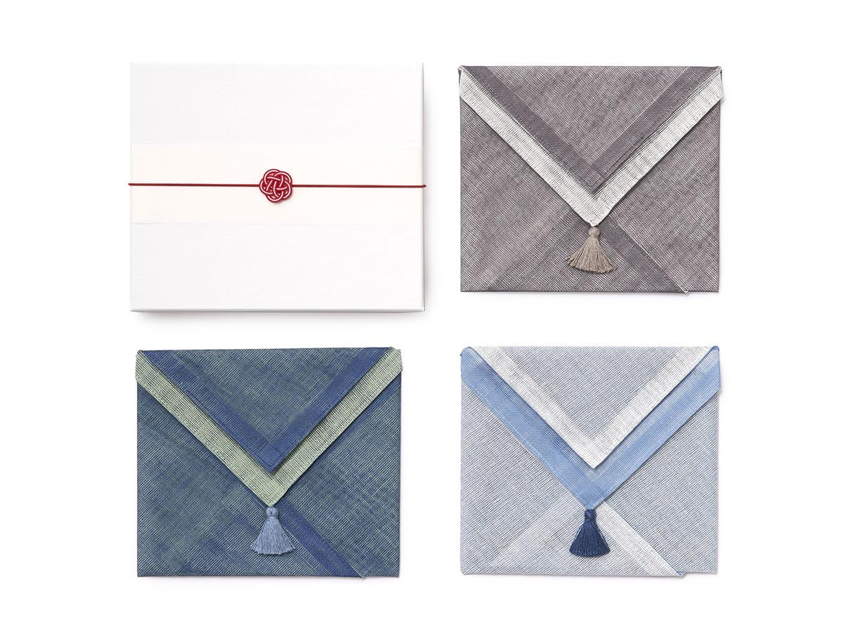 はんかちは1枚ずつ個包装した上で一つのボックスに入れ、赤色の水引バンドで止めています。