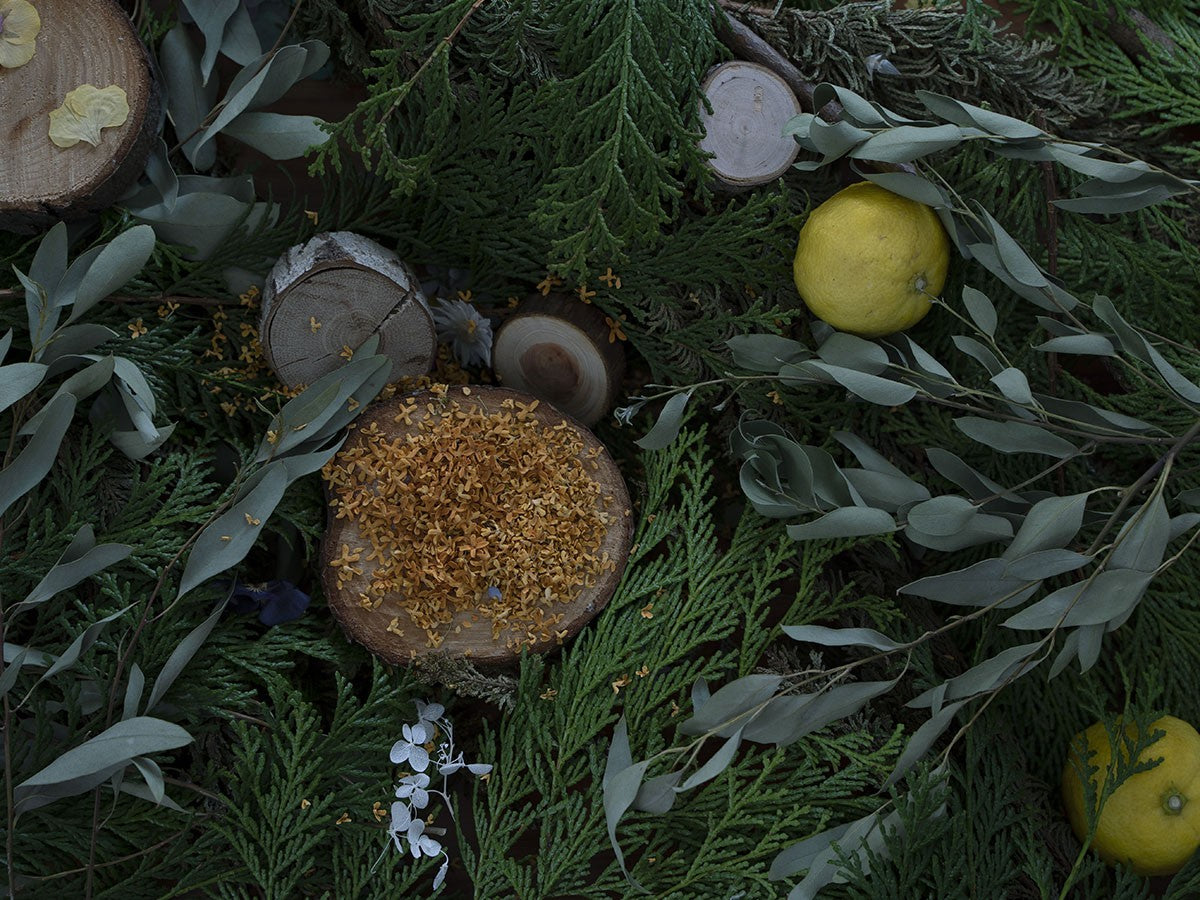 ミドル:オスマンサスアブソリュート(金木犀)、ネロリ、ローズアブソリュート、チュベローズアブソリュート、ゼラニウム、イランイラン、クラリセージ