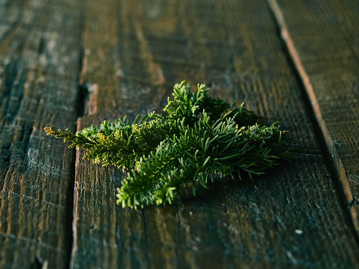 かつてはその樹液が薬として用いられた青森ヒバ。日本由来の木で唯一、抗菌・抗ウィルス作用を持つヒノキチオールとβ-ドラブリンの2つの成分を併せ持ちます。