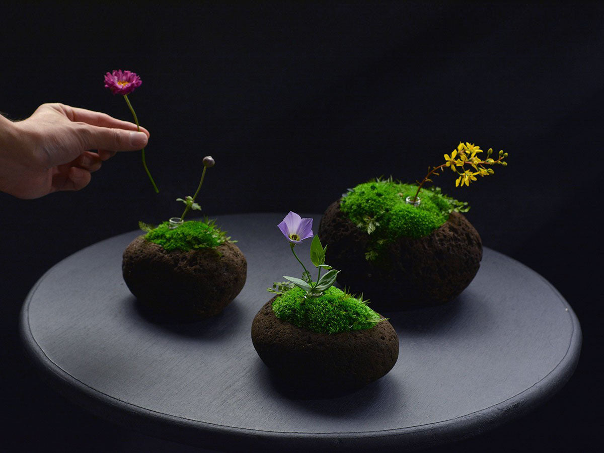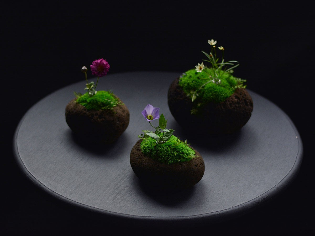 作家が一点ずつ制作しているため、浮石の形、色、苔や葉の景色に個体差があります。作品の特性としてご理解ください。プリザーブドフラワーを用いているため、お楽しみいただける期間は約2〜3年です。