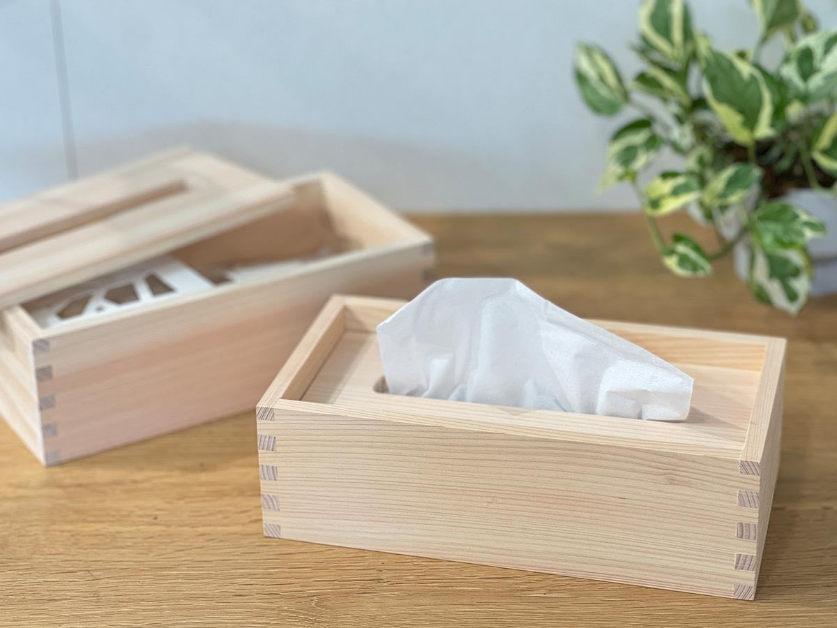 ひのき材ならではの柔らかい木目と手触り。お酒の升のように「あられ組」という釘を使わない接合方法でつくられています。ティッシュを箱のままでも、箱から出して入れることもでき、生活感を軽減します。