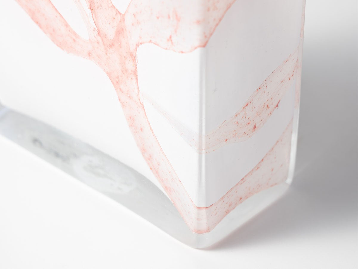 白地に淡いピンクでリボンのような模様を描いた、水彩画のような美しさのあるフラワーベースです。一つひとつ模様は異なります。上品で華やかなものがお好きな方へのギフトにおすすめです。